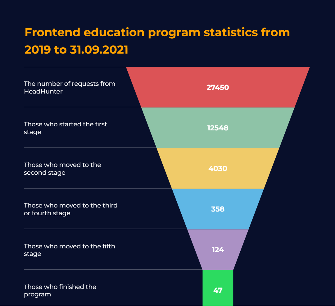 Since 2019, we have kept our promise and employed everyone who has completed the Education Program. We interviewed 32 frontend developers and 13 backend developers. They all became our colleagues. Fifteen people were employed by our partners. All of the graduates have passed the probationary period. Partners are seeking our graduates and looking forward to the next ones.