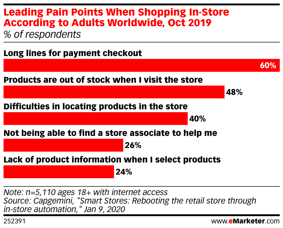 On the one hand, it has affected the recruitment, adaptation and staff performance. Only one salesperson can work in the entire self-checkout area, operating as a consultant at once. There is no need to hire more employees, train them, take care of vacations and sick leaves in the long run. On the other hand, self-checkouts solve one of the customers' problems — a checkout queue. About 60% of respondents complained about them.